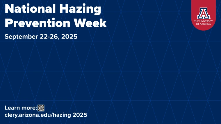 National Hazing Prevention Week is September 22nd through the 26th. This years theme is "Be the leader. Prevent hazing." University Compliance, in partnership with the Hazing Prevention Coalition, offers web-based training for professional staff and for students to learn more about hazing and what they can do to help to prevent hazing at the University of Arizona. You can learn more about these trainings at the links below. In addition, this webpage has more information about hazing and hazing prevention efforts at the university.